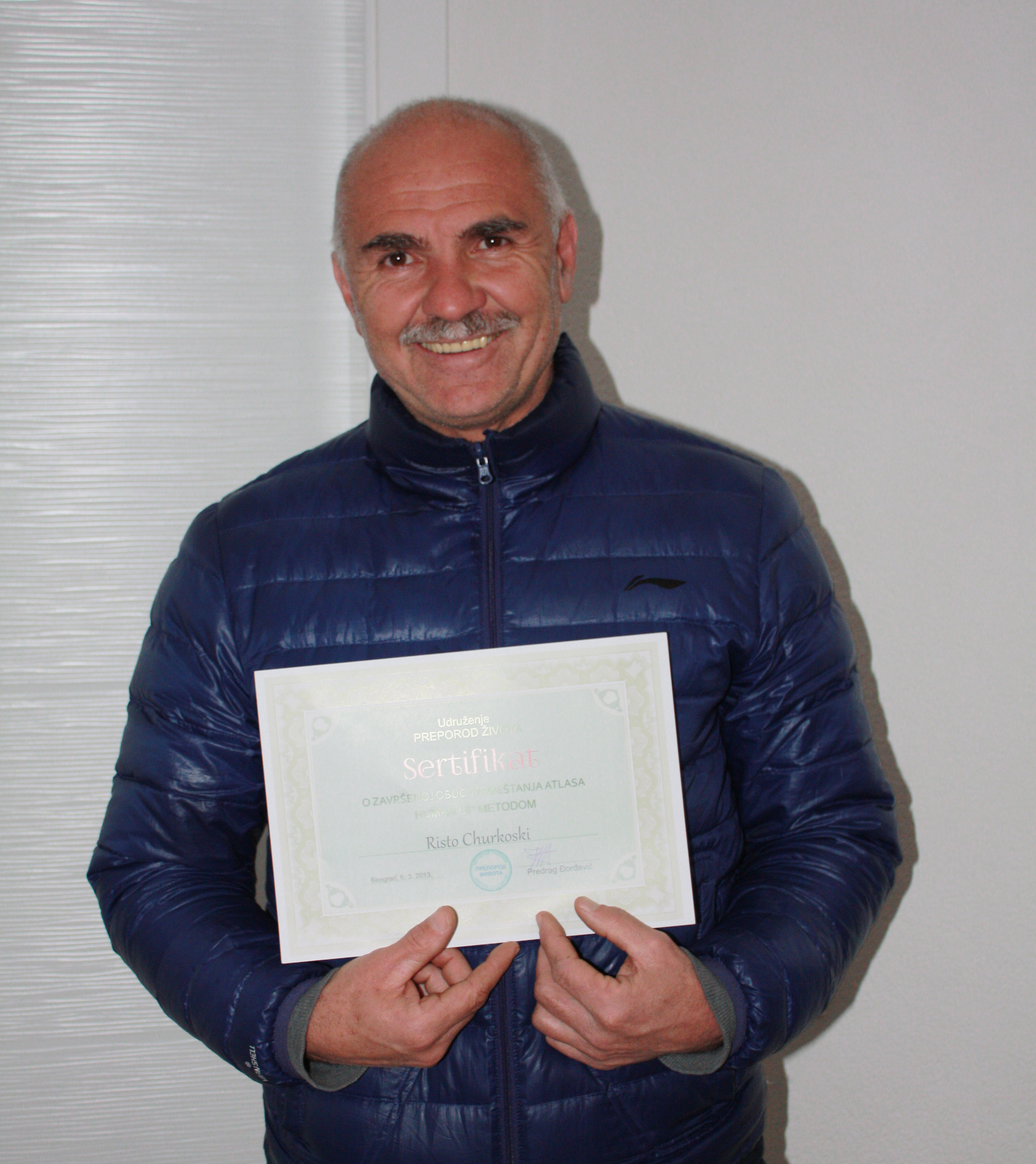 Мој близок пријател кон крајот на летото 2011 година воодушевено ми раскажа за неговото искуство и подобрувањата кои му се случиле после краток период од местењето на Атласот, како и за многу од вас зборот атлас го поврзував само со поимите по географија и историја. Не знаев дека првиот пршлен на вратот го носи името Атлас. Од кажаното и пребарувањето по интернет дојдов до заклучок дека сето тоа има логика и ако е нешто пртиснато нормално е да создава проблеми. Бидеќи ја почитувам превентивата без многу да размислувам си реков: лечењето е кога ќе дојде до него 10 пати поскапо. Мојата одлука им ја кажав на жена ми и на моите две ќерки, кои ме подржаа и посакаа и тие да одиме заедно и имавме фамилијарно местење на атласот. Никој од нас немаше здравствени проблеми или потешкотии, не сме оделе по болници, не сме земале лекарсва и лекови а сепак сме имале по нешто што ни создава одредени потешкотии. На третман бевме декември 2011 година. Во оваа прилика јас ќе кажам само за моето искуство по местењето на Атласот. Прашалникот кој се пополнува пред местење на Атласот кој се однесува за здравствената состојба го предадов празен бидеќи мислев дека тоа го правам превентивно. Г-динот Предраг Ѓорѓевиќ беше човекот (атласологот) кој го донесе мојот Атлас во неговата анатомска позиција, што сега ми претставува чест и големо задоволство. Одма после третманот, не повеќе од 15 мин. осетив како поубаво и полесно дишам. Ни на крај памет не ми беше дека со оваа терапија ќе се ослободам од долгогодишната болка која веќе стана и хронична на ахиловата тетива (десната нога), тоа ми беше спортска повреда која години наназад ја третирав на сите можни начини разни масти, физикални терапии но без резултат. Јас два дена после третманот како и секој ден отидов на тренинг и трчав не како пред пет години, трчав како пред 25 години, без болка во тетивата, многу енергија и подобро дишење. Не ми се веруваше дека тоа ми се случува па реков да не е некоја сугестија. Од тогаш до ден денес проблемот со тетивата го немам, не била никаква сугестија. Исто така приметив и дека моториката ми се подобри и слободно можам да кажам дека сега на 55 години функционирам многу подобро отколку пред 6 години. Покрај ова исто така приметив дека сум многу посмирен, стресните ситуации немаат на мене влиание како порано, едноставно се чувствувам навистина феноменално. Од сите превентивни работи што сум ги практикувал местењето на атласот е нешто од бога дадено и топло препорачувам независно дали сте здрав, болен, млад или стар терапијата е безопасна, безболна, не е ризична, единствено што може да изгубите е болките и болестите, а тие што имаат добро здравје такво да си го сочуваат долги години и без никакви таблети. Тоа е моето искуство а искуството од моја фамилија и пријатели, роднини кај кои исто така имаше многу здравствени подобрувања и излекувања е причината што одлучив во 2013 година да одам на обука за Атласолог.